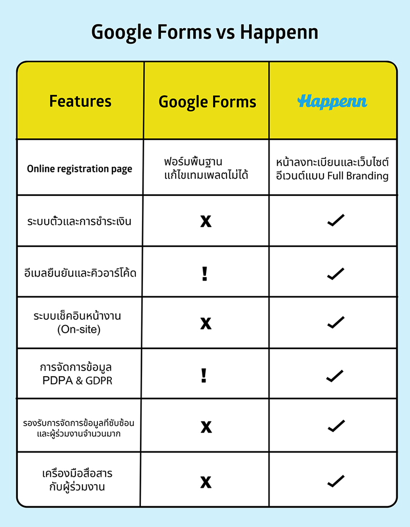 สรุป: หากเป็นงานภายในองค์กร Google Forms ตอบโจทย์มากค่ะ แต่หากเป็นงานระดับ Professional ที่ต้องคัดกรองแขก (Guest Management) การใช้แพลตฟอร์มสำหรับจัดการอีเวนต์โดยเฉพาะ Event Registration Platform อย่าง Happenn จะปิดช่องว่างเรื่องการยืนยันตัวตนและการควบคุมสิทธิ์ได้ดีกว่า